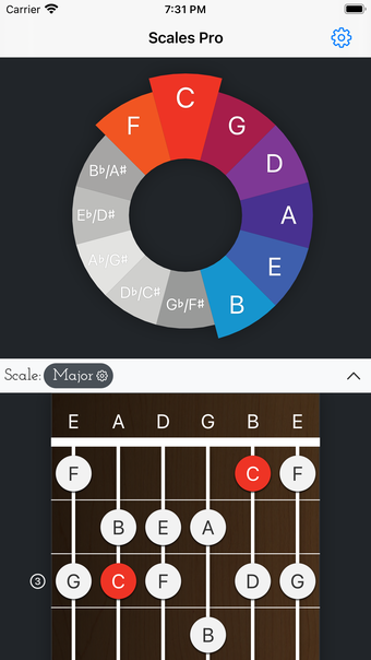 Scales Pro to edukacyjna aplikacja, która wykorzystuje koło piątek do nauki skal i akordów. Dzięki intuicyjnemu interfejsowi, możesz łatwo poruszać się po aplikacji, przesuwając palcem, aby obrócić koło i wybrać jedną z 12 tonacji chromatycznej skali. Dotknij tonacji, aby usłyszeć jej dźwięk.